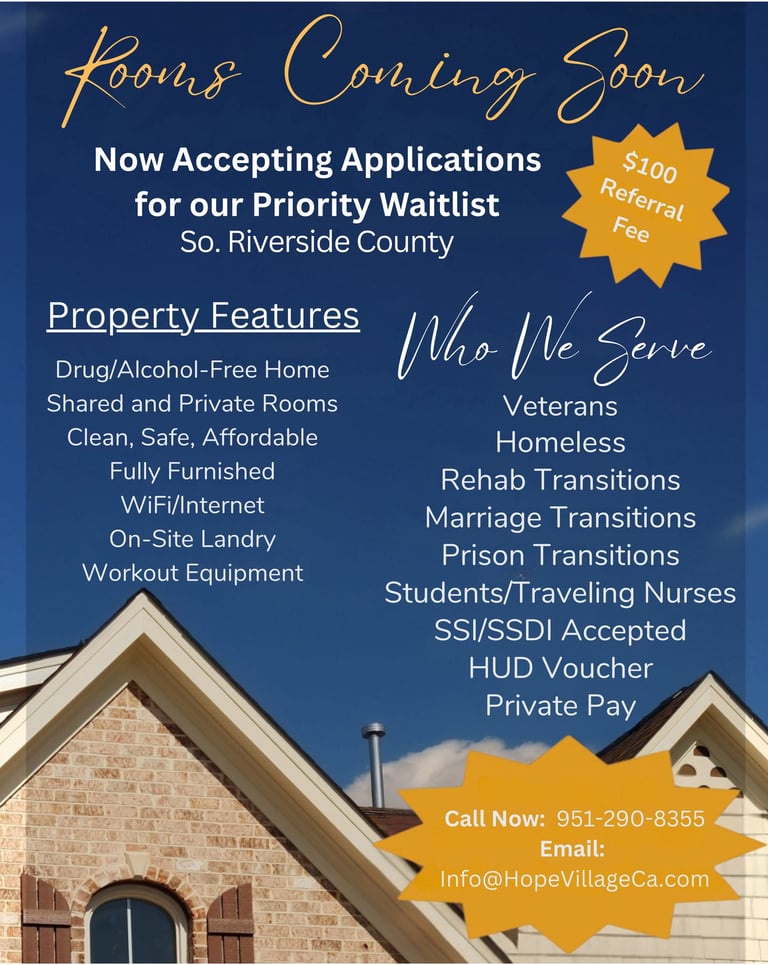 Thank you for your interest in Hope Village! At this time, we are accepting applications for our priority waitlist. Housing availability is limited, and rooms are not yet open for immediate move-in. Submitting an application does not guarantee placement, but it ensures you will be contacted as soon as an opening that fits your needs becomes available.